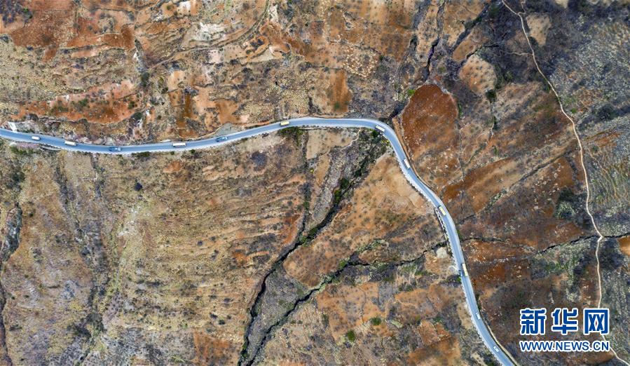 搬家的車(chē)隊(duì)在開(kāi)道警車(chē)的引領(lǐng)下從云南省永善縣大興鎮(zhèn)開(kāi)往魯?shù)榭h卯家灣易地扶貧安置區(qū)(3月15日攝,無(wú)人機(jī)照片)。 新華社記者 江文耀 攝