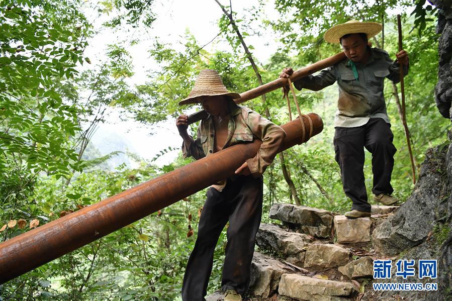 在廣西大化瑤族自治縣板升鄉(xiāng)弄雷村,工人們抬著抗旱飲水工程的水管在山路上前行(2016年8月10日攝)。廣西有近一半貧困人口生活在石漠化地區(qū),涉及數(shù)十個縣區(qū)。這里也是廣西飲水保障程度最低的地區(qū),解決貧困人口飲水問題是廣西脫貧攻堅(jiān)戰(zhàn)“硬仗中的硬仗”?!笆濉币詠恚瑥V西加快實(shí)施農(nóng)村飲水安全鞏固提升工程。因地制宜,采取新建、擴(kuò)建及管網(wǎng)延伸等多種措施,補(bǔ)齊貧困地區(qū)水利薄弱短板,進(jìn)一步提升石漠化地區(qū)群眾飲水安全保障水平,助推脫貧攻堅(jiān)。新華社記者黃孝邦攝