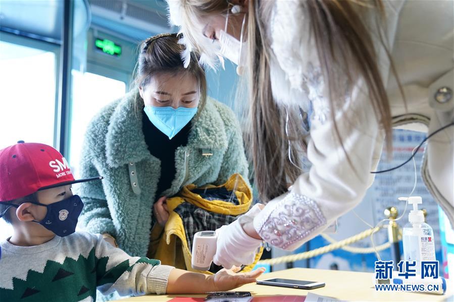 3月23日,在哈爾濱極地館入口,工作人員在給游客測(cè)量體溫。當(dāng)日,哈爾濱極地館恢復(fù)營(yíng)業(yè)。目前,極地館日接待人數(shù)不超過(guò)400人,園區(qū)采取分時(shí)段、間隔性辦法安排游客有序入園。游客實(shí)名預(yù)訂門(mén)票,入園要配合測(cè)溫、佩戴口罩、掃描“龍江健康碼”,刷身份證入館。新華社記者王建威攝
