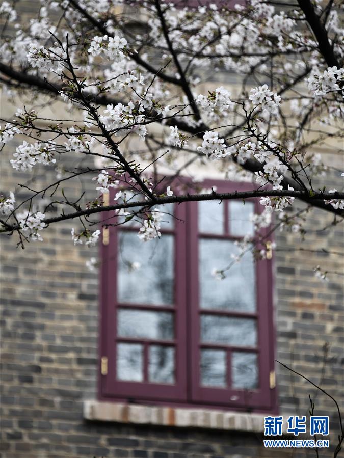 近日,隨著氣溫上升,武漢大學(xué)圖書館附近一片櫻花開放。新華社記者費茂華攝