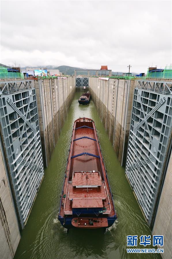 3月31日,船只駛入大藤峽水利樞紐工程船閘閘室。新華社記者崔博文攝