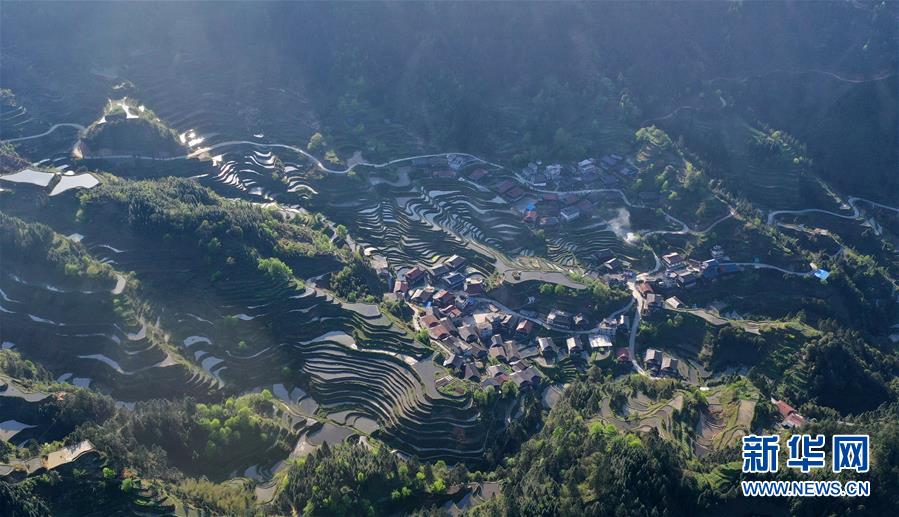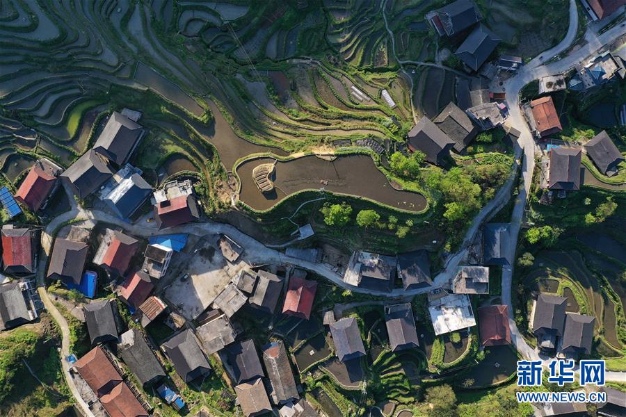 這是融水苗族自治縣桿洞鄉(xiāng)小河村高羽苗寨的木樓和梯田(3月31日攝,無人機照片)。新華社記者黃孝邦攝