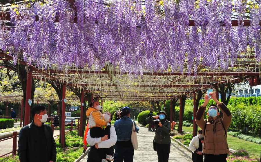2020年4月5日,上海,每年的4月上旬至5月初是觀賞紫藤花的最佳時(shí)期。清明小長(zhǎng)假里,晴好天氣使嘉定紫藤園迎來(lái)了不少市民游客。今年的紫藤公園采取提前預(yù)約和亮相綠色隨申碼的舉措入園賞花。公園擁有26個(gè)品種的紫藤花,盛開(kāi)時(shí)期的紫藤花穗最長(zhǎng)可達(dá)1米多?;ㄉ凶?,粉,白等,形成的花瀑宛若一簾幽夢(mèng),雅致春意今人流連忘返。