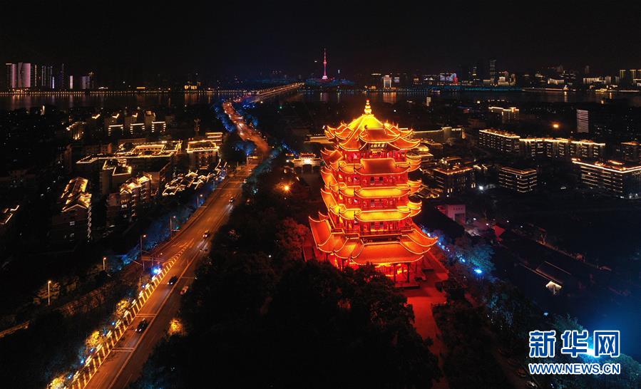 4月7日,開啟了燈光照明的武漢黃鶴樓(無人機照片)。新華社記者李賀攝