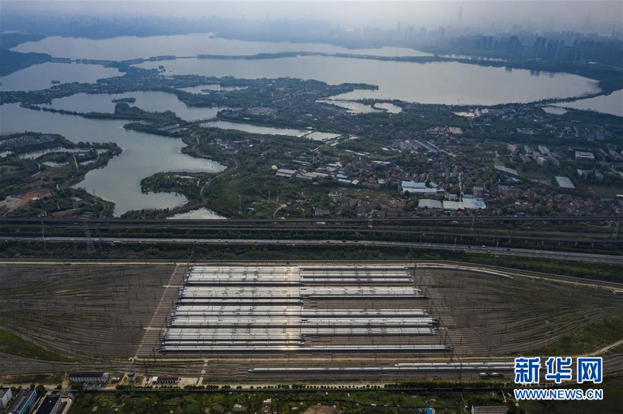 4月7日,在武漢動(dòng)車(chē)段,列車(chē)??吭诖孳?chē)線(xiàn)上(無(wú)人機(jī)照片)。