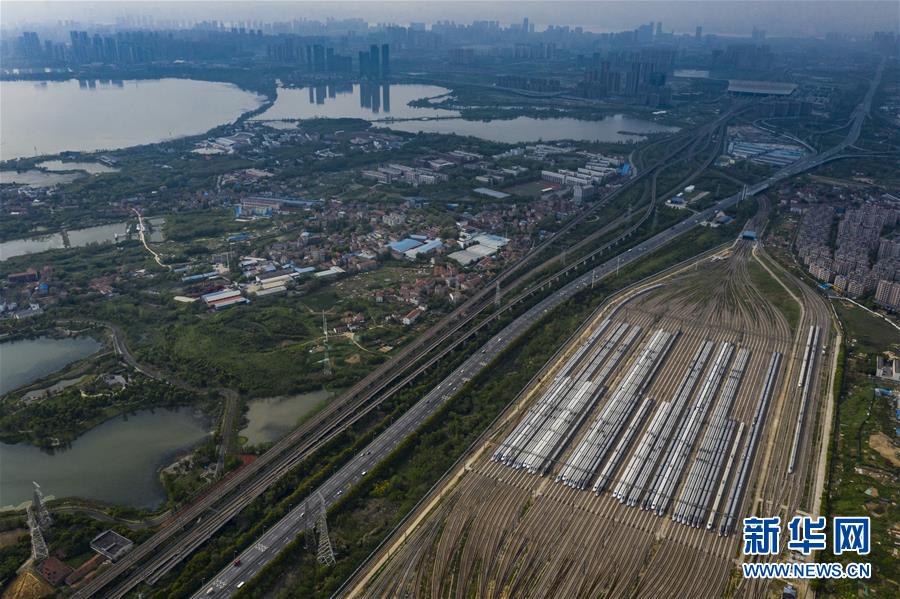 4月7日,在武漢動車段,列車??吭诖孳嚲€上(無人機(jī)照片)。新華社記者 沈伯韓 攝