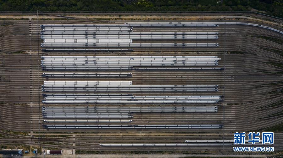 4月7日,在武漢動(dòng)車段,列車停靠在存車線上(無(wú)人機(jī)照片)。新華社記者 沈伯韓 攝