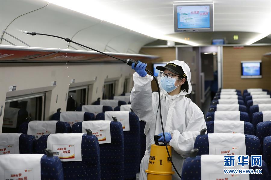 4月7日,武漢動(dòng)車段運(yùn)用車間工作人員周明輝在給列車消毒。 新華社記者 沈伯韓 攝
