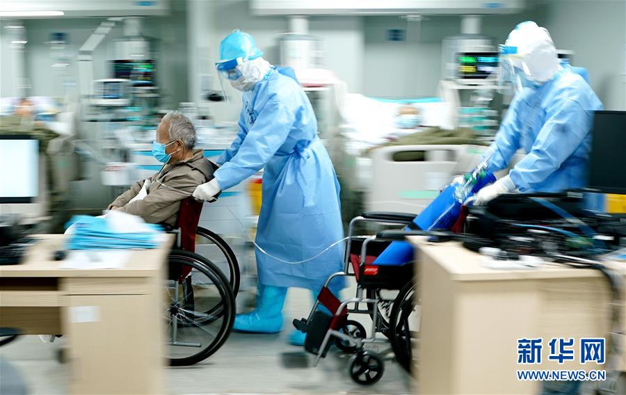 3月20日,武漢火神山醫(yī)院重癥醫(yī)學(xué)一科副主任宋立強(中)護送81歲的新冠肺炎重癥患者去做CT檢查。為確?;颊哂谐渥愎┭?,醫(yī)生胡世頡推著氧氣瓶隨行。 新華社記者 王毓國 攝