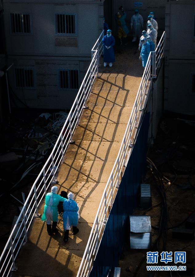 2月4日,醫(yī)護人員將患者送入武漢火神山醫(yī)院病房(無人機照片)。 新華社記者 肖藝九 攝