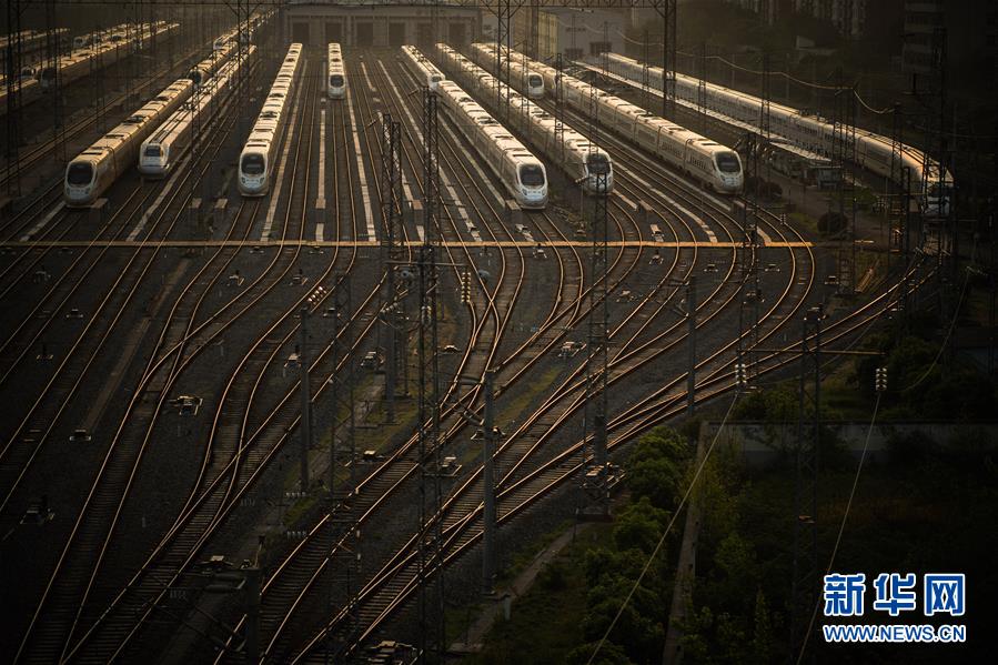 4月8日,在武漢動車段,列車??吭诖孳嚲€上準(zhǔn)備投入運(yùn)行。 新華社記者 肖藝九 攝