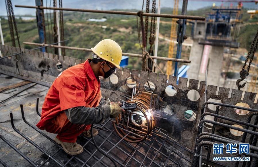 3月5日,工人在中老鐵路南溪河特大橋上施工。新華社記者江文耀攝