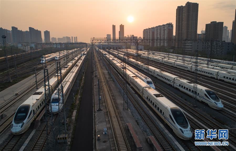 4月8日,在武漢動(dòng)車段,列車停靠在存車線上準(zhǔn)備投入運(yùn)行(無(wú)人機(jī)照片)。新華社記者肖藝九攝