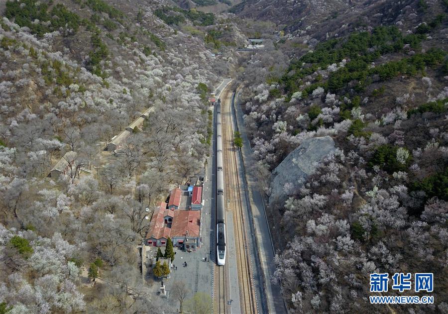 4月8日,北京青龍橋火車站附近春花盛開(無人機照片)。 新華社記者張晨霖攝