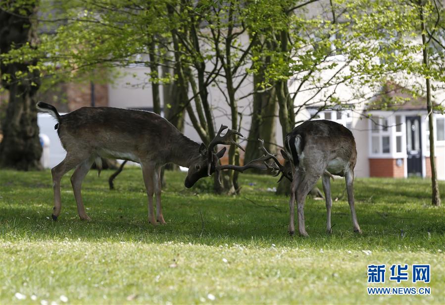 4月8日,在英國倫敦東部一個(gè)居民區(qū),附近公園里的鹿在草坪上駐足。隨著新冠疫情在英國的擴(kuò)散,政府要求人們減少不必要的外出。倫敦東部一個(gè)居民區(qū)附近公園里原來散養(yǎng)的鹿紛紛從公園走出來,或吃草或接受附近居民的喂食,成為特殊時(shí)期居民區(qū)里的新“客人”。新華社記者韓巖攝