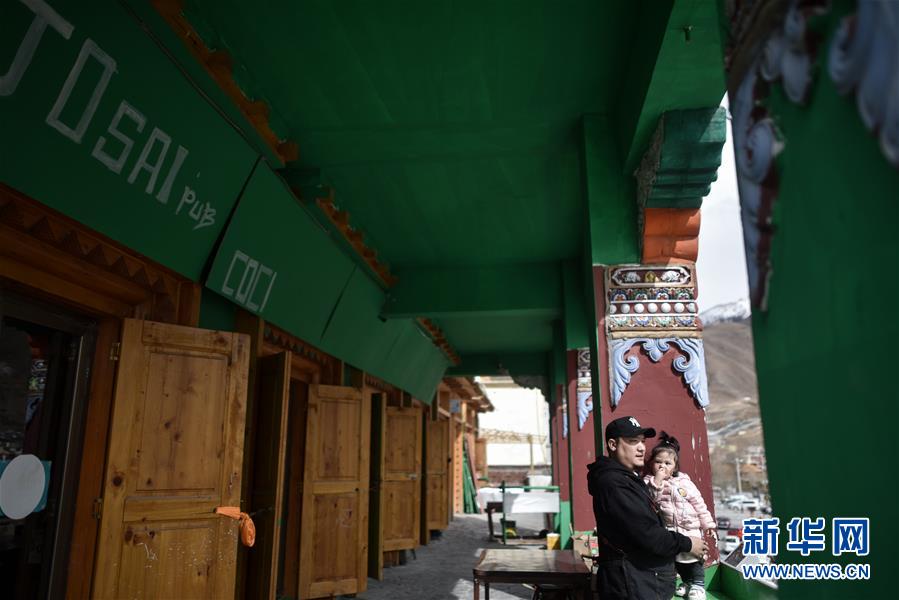4月10日,才仁俄賽和女兒在餐廳門(mén)口遠(yuǎn)眺玉樹(shù)街景。新華社記者吳剛攝