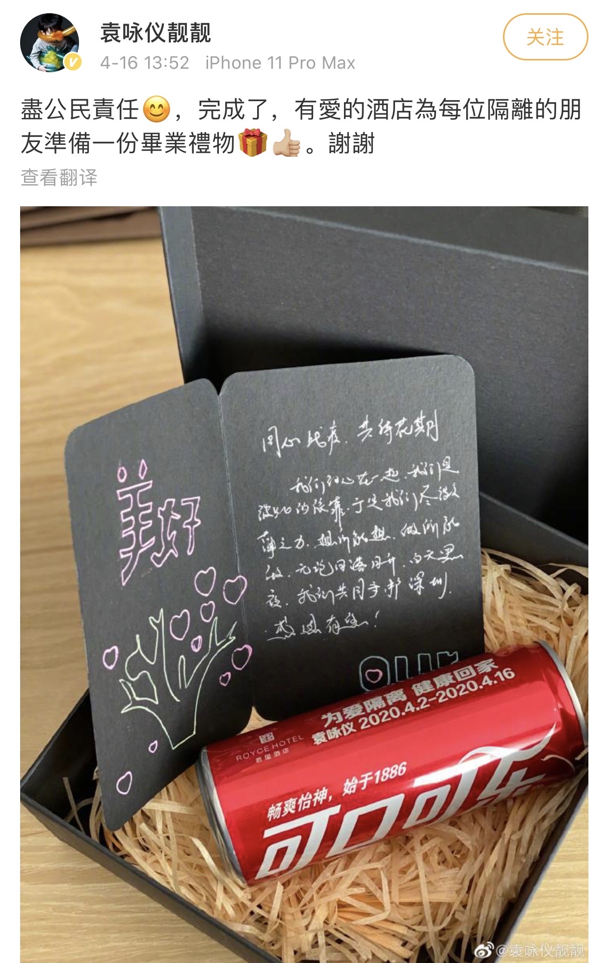 近日,香港藝人袁詠儀發(fā)了一條微博,曬出了一份特別的“畢業(yè)禮物”,這是深圳一酒店為每位結(jié)束隔離的公民準(zhǔn)備的,除了有一瓶“為愛隔離、健康回家”的飲料,還有一張“同心戰(zhàn)疫、共待花期”的暖心賀卡。