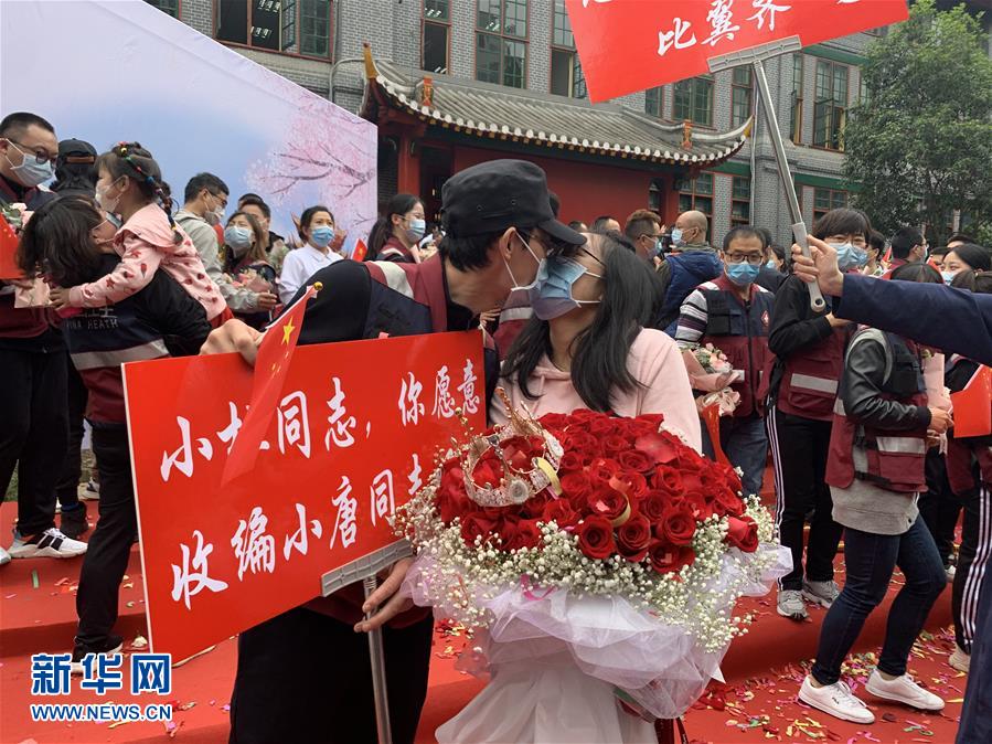 4月21日,在四川大學(xué)華西醫(yī)院,醫(yī)療隊隊員向女友現(xiàn)場求婚。當(dāng)日,來自四川大學(xué)華西醫(yī)院、華西第二醫(yī)院、華西第四醫(yī)院的醫(yī)療隊隊員解除隔離休整,與分別許久的家人、同事團(tuán)聚,緊緊相擁。新華社記者盧宥伊攝