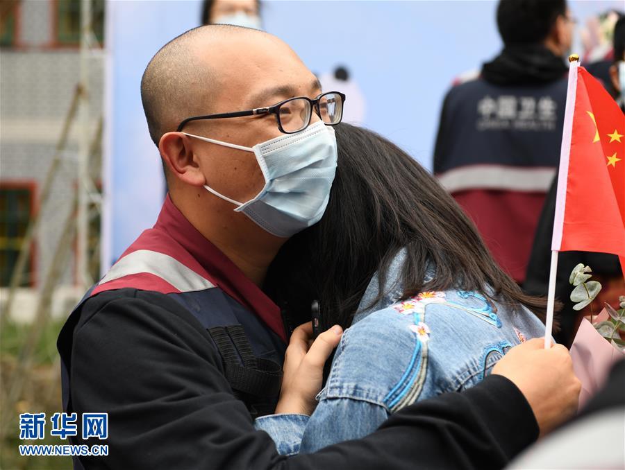 4月21日,在四川大學(xué)華西醫(yī)院,醫(yī)療隊(duì)隊(duì)員和家人相互擁抱。當(dāng)日,來自四川大學(xué)華西醫(yī)院、華西第二醫(yī)院、華西第四醫(yī)院的醫(yī)療隊(duì)隊(duì)員解除隔離休整,與分別許久的家人、同事團(tuán)聚,緊緊相擁。新華社記者王曦?cái)z