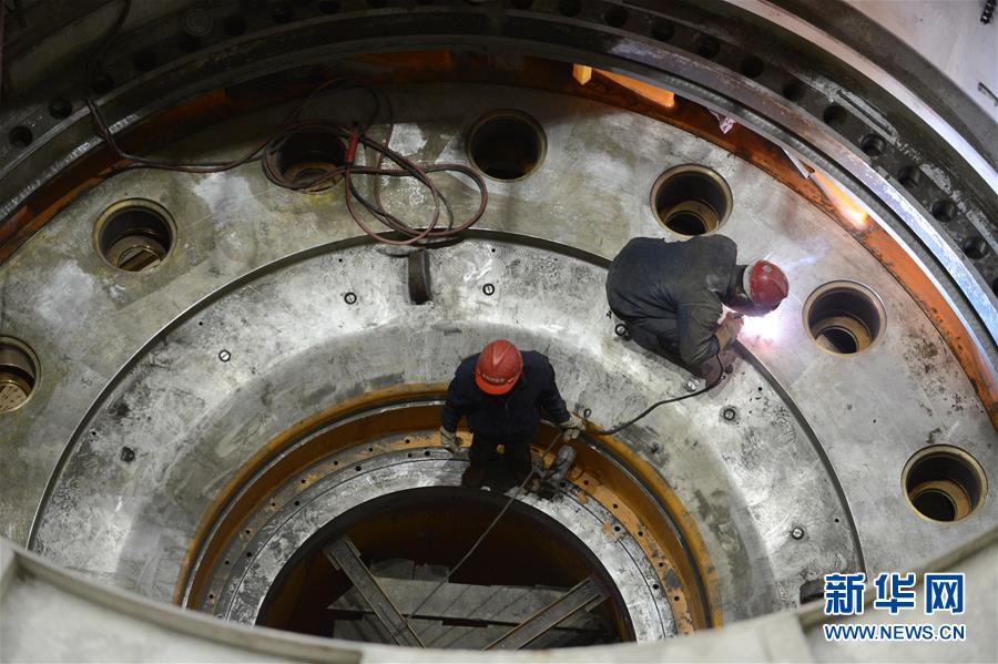 4月24日,工人在施工現(xiàn)場進行機組底環(huán)與錐管焊縫打磨作業(yè)。新華社記者韓曉雨攝