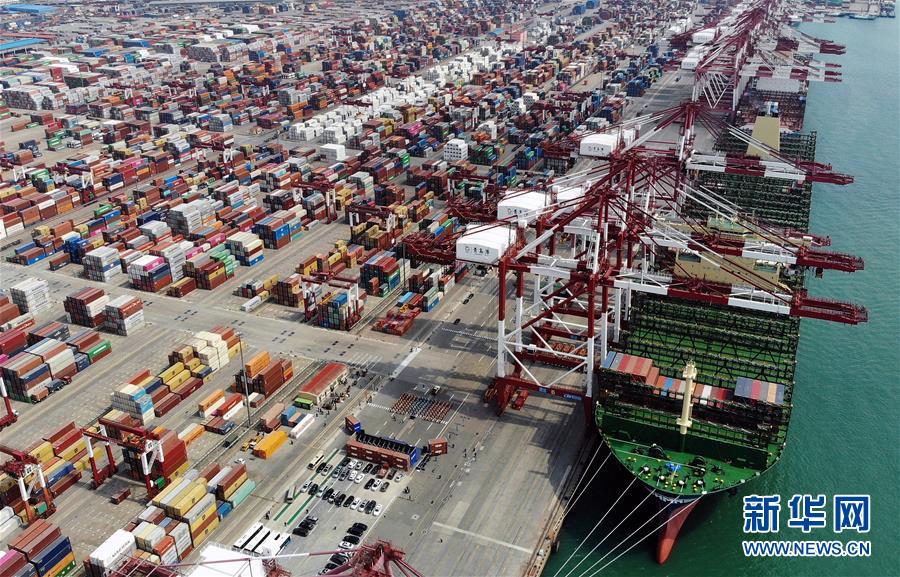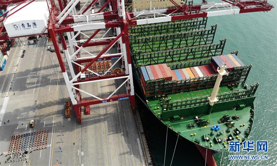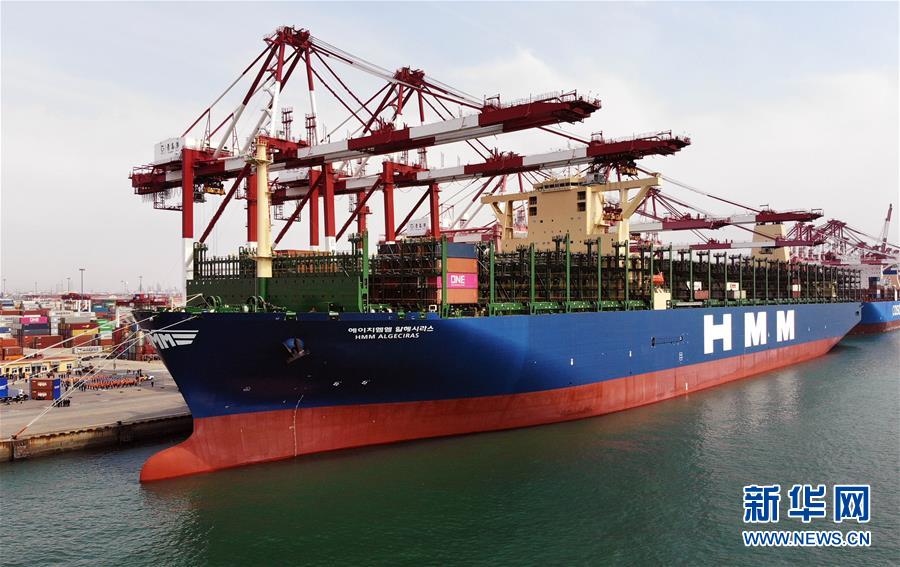 “現(xiàn)代商船阿爾赫西拉斯”輪靠泊在青島港前灣碼頭(無人機(jī)照片,4月26日攝)。當(dāng)日,載箱量可達(dá)2.4萬標(biāo)準(zhǔn)箱的世界最大集裝箱船“現(xiàn)代商船阿爾赫西拉斯”輪從山東青島港開啟首航,這條船的甲板面積超過2.4萬平方米,相當(dāng)于3.5個(gè)標(biāo)準(zhǔn)足球場(chǎng)大小。新華社記者李紫恒攝