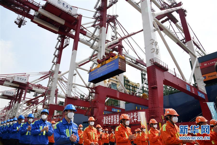 4月26日,在青島港前灣碼頭,碼頭工人參加“現(xiàn)代商船阿爾赫西拉斯”輪首航儀式。當日,載箱量可達2.4萬標準箱的世界最大集裝箱船“現(xiàn)代商船阿爾赫西拉斯”輪從山東青島港開啟首航,這條船的甲板面積超過2.4萬平方米,相當于3.5個標準足球場大小。新華社記者李紫恒攝