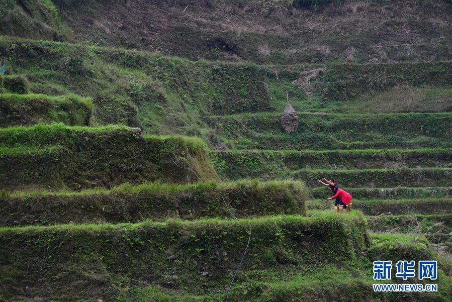 3月25日,在桂黔烏英苗寨,村民往稻田里投放螺苗。新華社記者黃孝邦攝