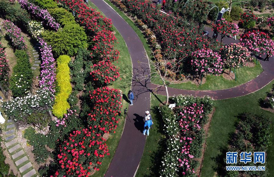 4月28日,游人在上海辰山植物園的月季島上賞花(無人機照片)。近日,上海迎來月季花期,上海辰山植物園的月季島上,各色月季競相綻放,形成絢爛花海。新華社記者劉穎攝