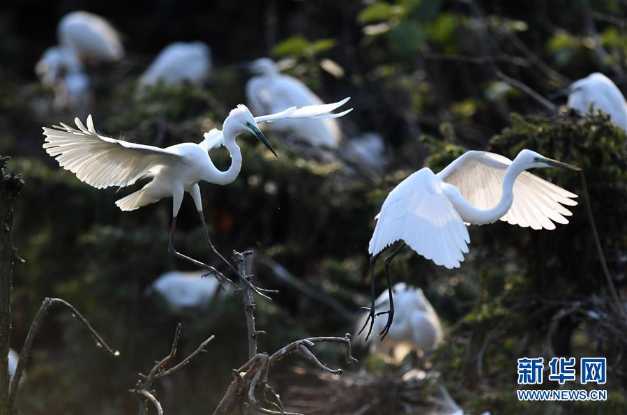 白鷺在位于鄱陽(yáng)湖畔的南昌市象山森林公園內(nèi)棲息(4月27日攝)。近日,在江西省南昌市新建區(qū)象山森林公園內(nèi),已安家筑巢的大批白鷺進(jìn)入繁殖旺季。在夕陽(yáng)的照耀下,白鷺時(shí)而翩翩起舞,時(shí)而展翅盤(pán)旋,構(gòu)成一幅美麗的自然生態(tài)畫(huà)卷。新華社記者萬(wàn)象攝