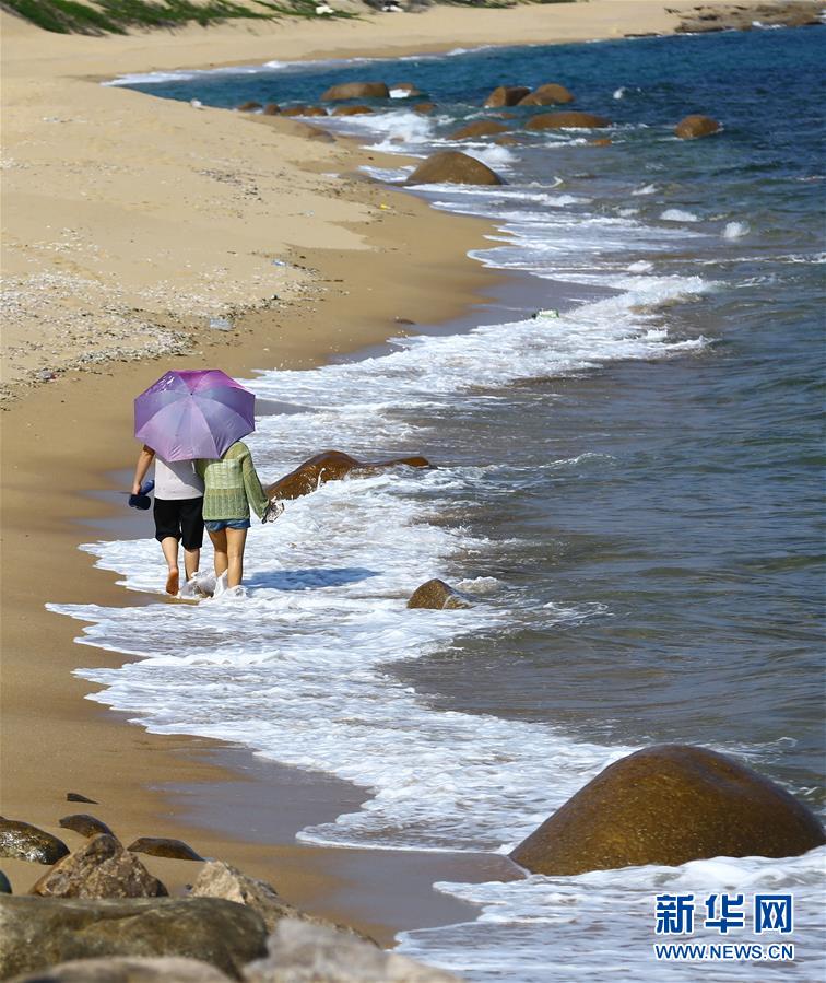 5月2日,游客在海南省三亞市南山景區(qū)海邊踏浪休閑?!拔逡弧奔偃掌陂g,人們以多種方式放松心情、享受假日。新華社發(fā)(陳文武攝)