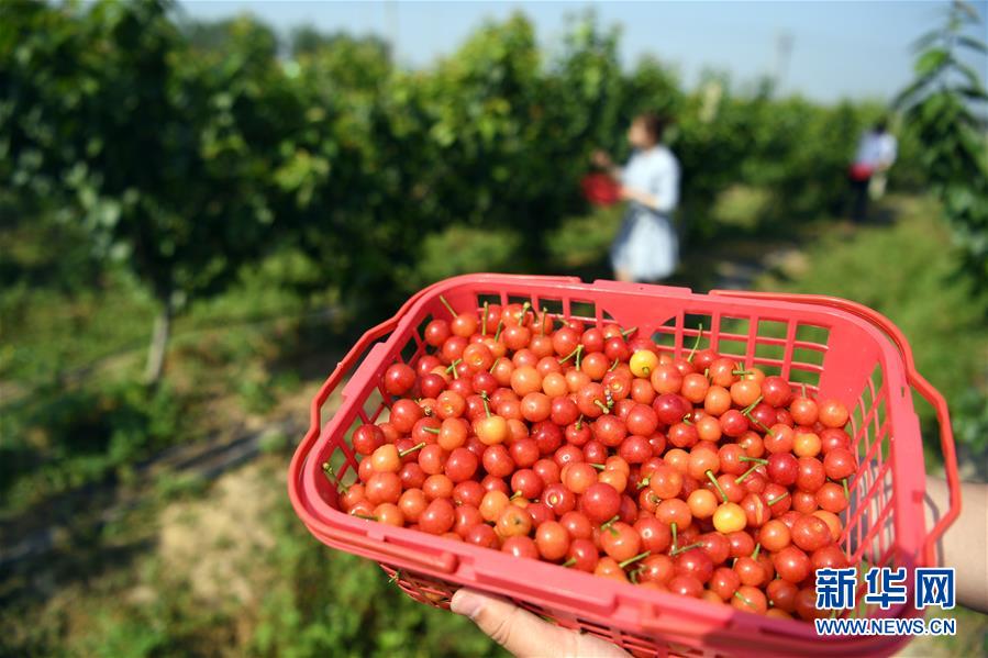 5月3日,游客在豐樂(lè)鎮(zhèn)鳳嶺苗木種植扶貧產(chǎn)業(yè)園里體驗(yàn)采摘櫻桃。新華社記者劉軍喜攝