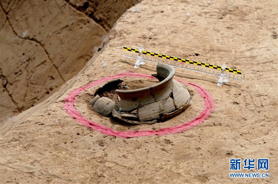 這是4月28日拍攝的雙槐樹遺址內(nèi)用陶罐模擬的北斗九星天文遺跡。新華社記者李安攝