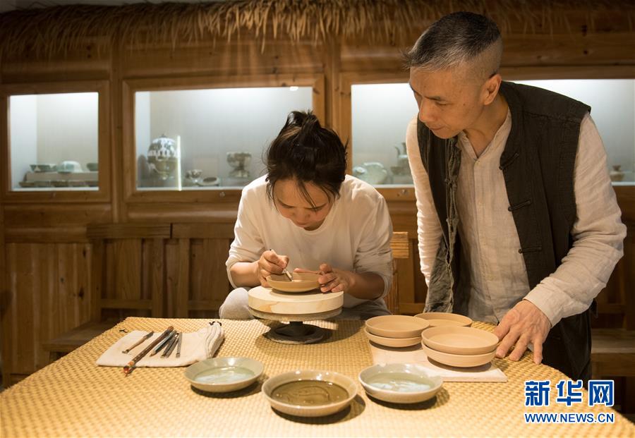 5月8日,“90后”瓷人湯佳(左)在龍泉青瓷裝飾紋樣研究所對(duì)著項(xiàng)宏金收藏的古瓷器刻劃魚(yú)紋盤(pán)。1965年出生的項(xiàng)宏金,被浙江龍泉年輕一代瓷人稱(chēng)為“項(xiàng)哥”,他從20世紀(jì)90年代開(kāi)始收集龍泉青瓷標(biāo)本,研究青瓷紋樣。2014年出版著作《龍泉青瓷裝飾紋樣》,次年開(kāi)設(shè)龍泉青瓷裝飾紋樣研究所,將自己收藏的千余件標(biāo)本跟瓷器愛(ài)好者、創(chuàng)作者免費(fèi)分享。新華社記者翁忻旸攝