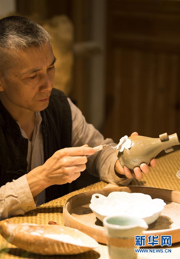 5月8日,項(xiàng)宏金在龍泉青瓷裝飾紋樣研究所修復(fù)古瓷器。1965年出生的項(xiàng)宏金,被浙江龍泉年輕一代瓷人稱(chēng)為“項(xiàng)哥”,他從20世紀(jì)90年代開(kāi)始收集龍泉青瓷標(biāo)本,研究青瓷紋樣。2014年出版著作《龍泉青瓷裝飾紋樣》,次年開(kāi)設(shè)龍泉青瓷裝飾紋樣研究所,將自己收藏的千余件標(biāo)本跟瓷器愛(ài)好者、創(chuàng)作者免費(fèi)分享。新華社記者翁忻旸攝