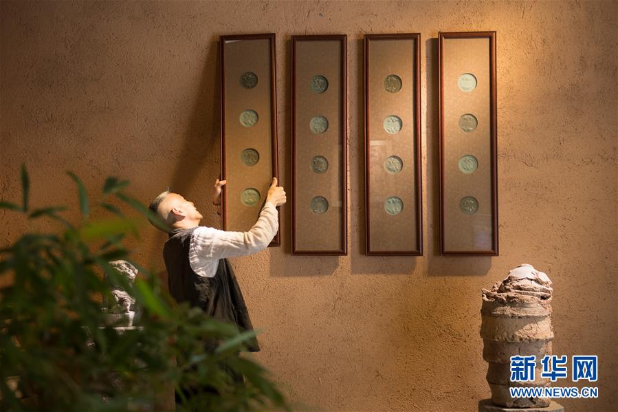 5月7日,項(xiàng)宏金在龍泉青瓷裝飾紋樣研究所懸掛用古青瓷標(biāo)本制作的掛框。1965年出生的項(xiàng)宏金,被浙江龍泉年輕一代瓷人稱(chēng)為“項(xiàng)哥”,他從20世紀(jì)90年代開(kāi)始收集龍泉青瓷標(biāo)本,研究青瓷紋樣。2014年出版著作《龍泉青瓷裝飾紋樣》,次年開(kāi)設(shè)龍泉青瓷裝飾紋樣研究所,將自己收藏的千余件標(biāo)本跟瓷器愛(ài)好者、創(chuàng)作者免費(fèi)分享。新華社記者翁忻旸攝