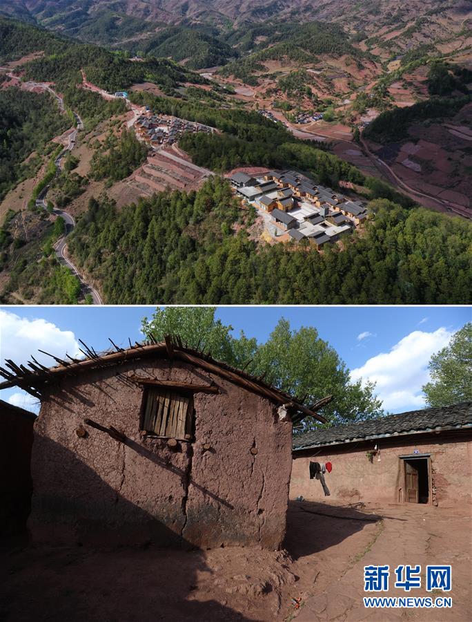 這是一張拼版照片,上圖為:昭覺縣三岔河鄉(xiāng)三河村一個易地扶貧安置點(2020年4月20日攝,無人機照片);下圖為:昭覺縣三岔河鄉(xiāng)三河村村民原來居住的土坯房(2020年4月20日攝)。新華社記者江宏景攝
