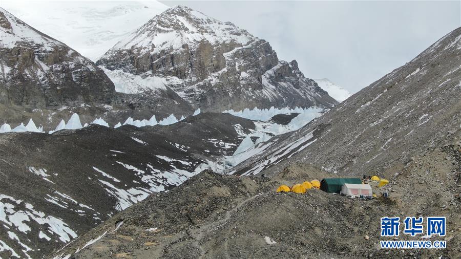 這是海拔5800米的珠峰過渡營地(5月8日攝,無人機照片)。珠峰過渡營地海拔5800米,是連接前進營地和珠峰大本營的重要一站。登山愛好者從大本營徒步大約四個小時就能抵達過渡營地。此段路程亂石林立,同時也能欣賞壯美的冰川。新華社記者孫非攝
