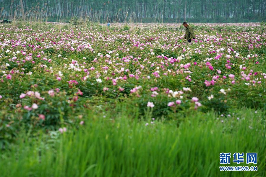 工作人員在金湖縣金燦芍藥園里進行農(nóng)業(yè)管理(5月11日攝)。新華社記者韓瑜慶攝