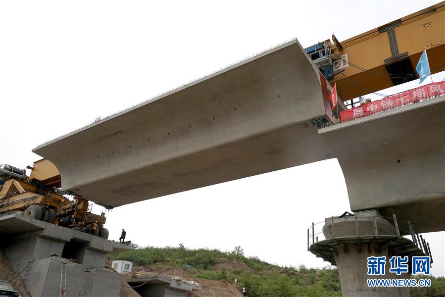 5月13日,運架一體機在位于河南焦作的施工現(xiàn)場進行架梁作業(yè)。 當日,隨著最后一榀長24米、重552噸的箱梁架設就位,太焦高鐵全線橋梁架設完成。從山西太原到河南焦作的太焦高鐵是國家規(guī)劃建設的“八縱八橫”高速鐵路網(wǎng)的重要組成部分,計劃2020年底建成通車。 新華社記者李安攝