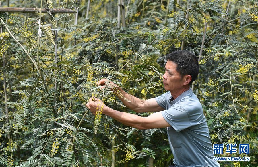 5月13日,在廣西環(huán)江毛南族自治縣下南鄉(xiāng)下塘村,村民在管護(hù)中草藥。新華社記者陸波岸攝