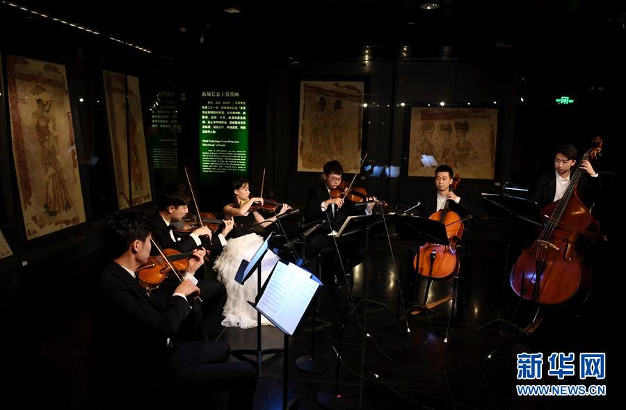 在陜西歷史博物館唐代壁畫珍品館,西安交響樂團小提琴首席周虎翼、第二小提琴首席白東旭、第二小提琴演奏員葉姣睿、中提琴演奏員時少愷、大提琴演奏員于丁和低音提琴演奏員趙子杰(從左至右)為“云上國寶”音樂會彩排(5月14日攝)。為迎接國際博物館日,5月14日,西安交響樂團走進陜西歷史博物館唐代壁畫珍品館,為5月18日的“云上國寶”音樂會彩排。觀眾將通過網絡直播,在聆聽天籟的同時欣賞國之瑰寶,感受藝術與美的和諧共鳴。新華社記者李一博攝