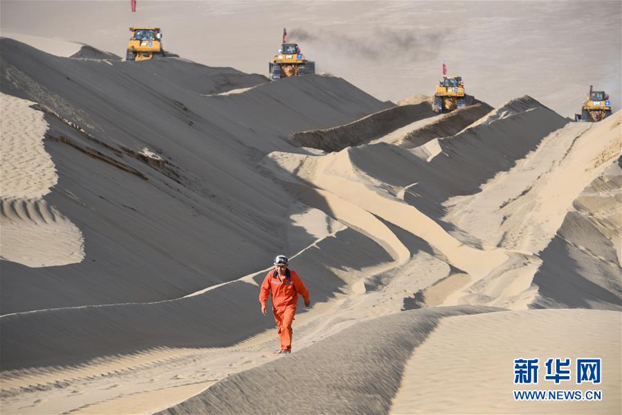 工人李明友在施工現(xiàn)場爬上沙丘(5月16日攝)。新華社記者宋彥樺攝