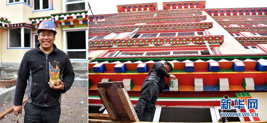 拼版照片:左圖為西藏昌都市卡若區(qū)卡若鎮(zhèn)卡若村村民洛松郎直;右圖為洛松郎直在昌都市一處建筑工地進行外墻彩繪作業(yè)。洛松郎直從小就喜歡畫畫,由于家境貧寒,初中畢業(yè)后,他回到家里干農(nóng)活、放牧,挑起家庭重擔,但一直沒有放棄畫畫的夢想。后來,洛松郎直前往卡若區(qū)拉多鄉(xiāng)學習唐卡繪畫,技藝得到很大提高。2017年,洛松郎直為卡若區(qū)一個周轉(zhuǎn)房建設項目繪制墻體彩繪。2018年,在村里的支持下,洛松郎直創(chuàng)辦了公司,承攬更多的藏式墻體彩繪工程(4月30日攝)。新華社記者詹彥攝