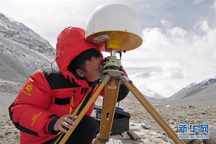 國測一大隊(duì)隊(duì)員在珠峰大本營附近測試設(shè)備(5月17日攝)。新華社記者普布扎西攝