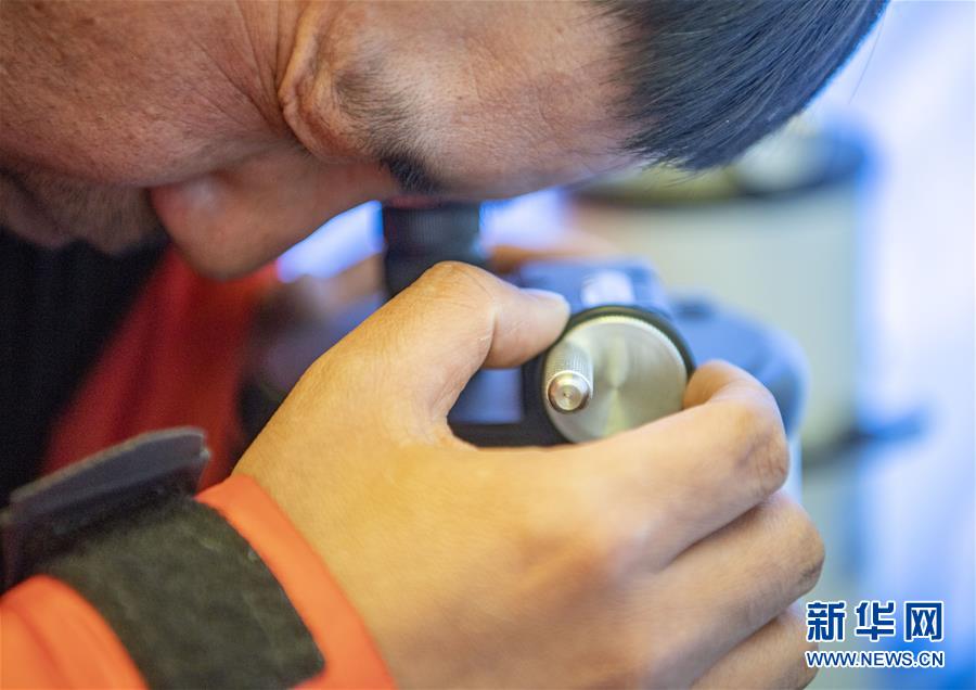 國測一大隊(duì)隊(duì)員在珠峰大本營測試地面測量中使用的重力儀(5月3日攝)。新華社記者晉美多吉攝