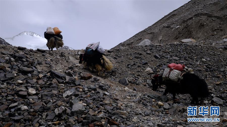 牦牛運輸隊向海拔5800米的過渡營地運輸物資(5月19日攝)。新華社記者晉美多吉攝