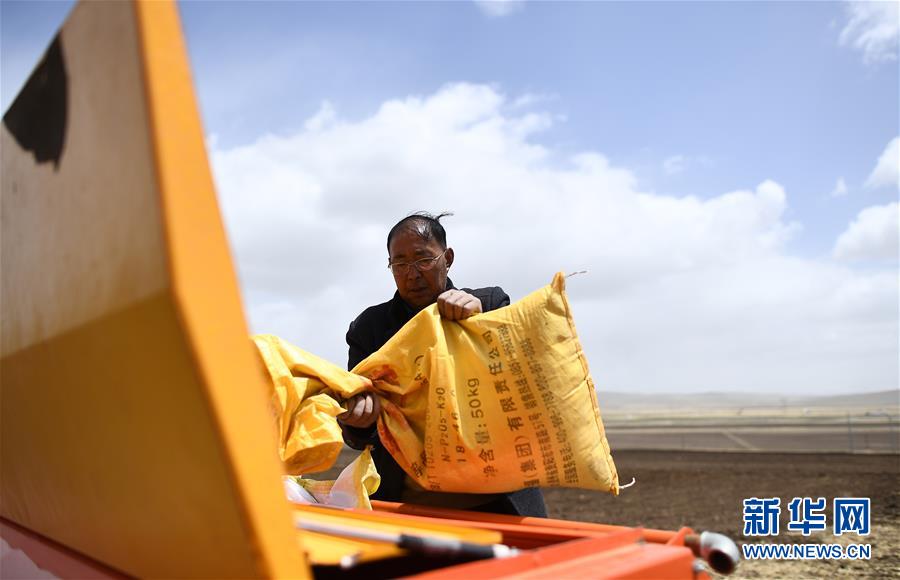 在青海省海北藏族自治州海晏縣青海湖鄉(xiāng)同寶村,者成倉準備播種(5月13日攝)。新華社記者張宏祥攝