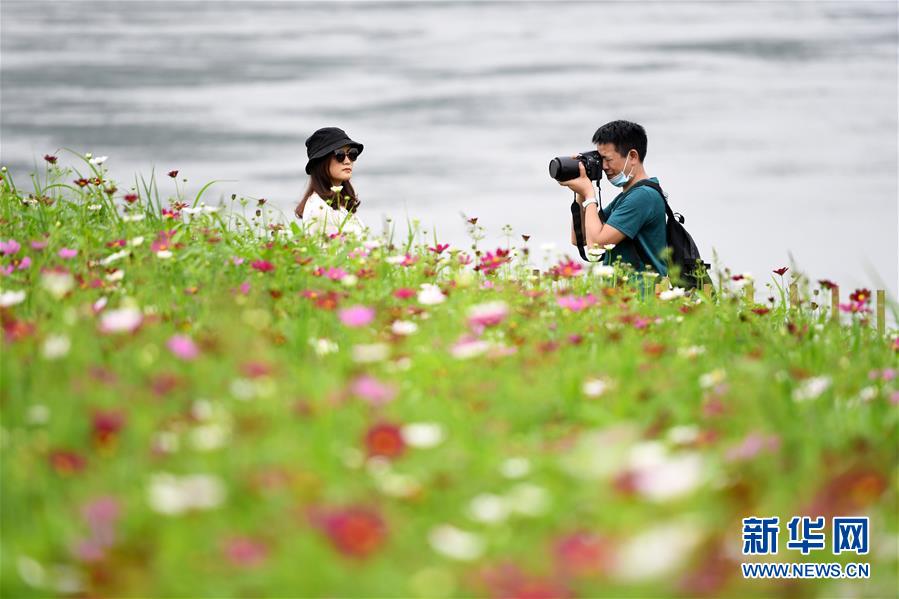 5月20日,在重慶市巴南區(qū)木洞鎮(zhèn)長江岸邊,游客在格?;êV信恼樟裟?。近日,重慶市巴南區(qū)木洞鎮(zhèn)長江岸邊的格桑花競相開放,吸引游客前來賞花觀景。新華社記者唐奕攝
