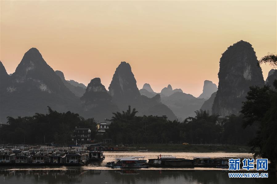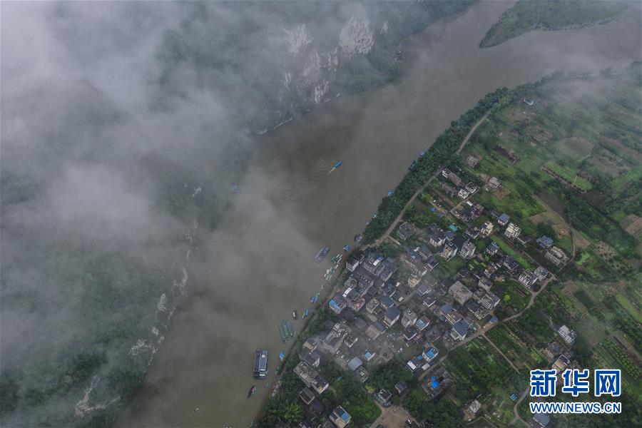 這是在廣西桂林市陽朔縣興坪鎮(zhèn)拍攝的山水風光(5月21日攝,無人機全景照片)?!吧n蒼森八桂,茲地在湘南。江作青羅帶,山如碧玉篸……”一千多年前,唐朝詩人韓愈寫盡桂林山水之美。初夏時節(jié),在廣西桂林市陽朔縣興坪鎮(zhèn),藍天白云下,煙雨朦朧中,桂林山水盡顯秀美。新華社記者周華攝