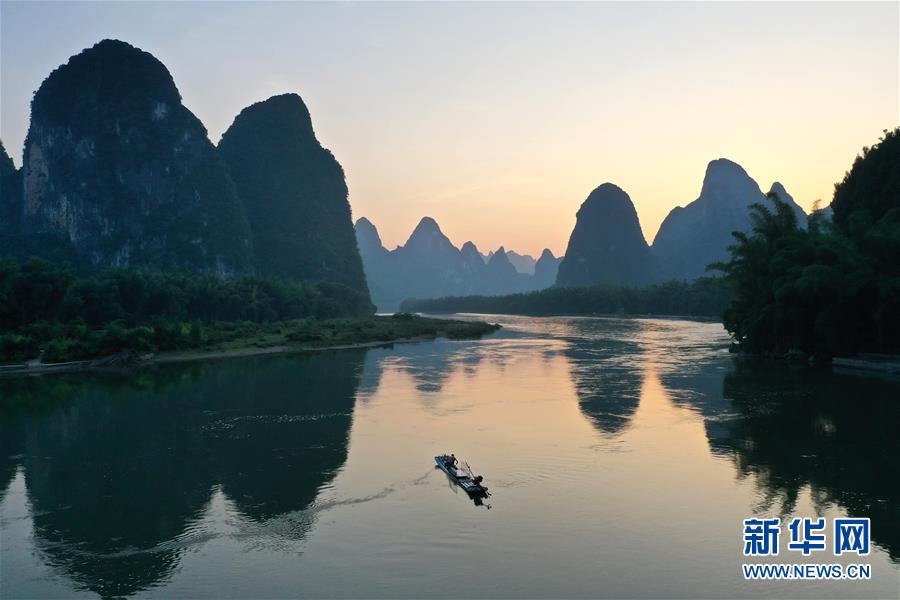 這是在廣西桂林市陽朔縣興坪鎮(zhèn)拍攝的山水風光(5月19日攝,無人機照片)?!吧n蒼森八桂,茲地在湘南。江作青羅帶,山如碧玉篸……”一千多年前,唐朝詩人韓愈寫盡桂林山水之美。初夏時節(jié),在廣西桂林市陽朔縣興坪鎮(zhèn),藍天白云下,煙雨朦朧中,桂林山水盡顯秀美。新華社記者 周華 攝